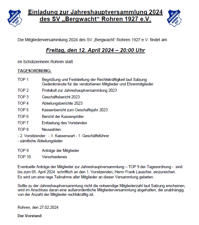 Einladung zur Jahreshauptversammlung 2024, 29.02.2024